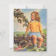 Vintage illustration children image featuring a girl sitting on a rock wall watching a mother bird feeding her baby birds in their nest. The spring season is here!