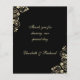 An elegant way to showcase your wedding menu to all your guests. Add the first course, second course and dessert options. The reverse you'll add a personal message and you names. A dramatic black menu with vintage gold swirls.