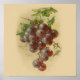An illustration of a bunch of purple red grapes hanging on the vine with leaves, on a dark cream or beige background, from a vintage painting by artist Catharina or Catherine Klein, born 1861.