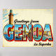 Celebrate Italy’s proud port city with this retro postcard-style illustration. “GENOA” appears in bold uppercase letters filled with miniature images of the Porto Antico, Lanterna lighthouse, mediaeval streets, and the Royal Palace. The colourful background shows the harbour and pastel houses in a nostalgic style. Perfect as a calendar for Italian coastal city lovers.