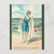 This postcard features a vintage illustration of a woman wearing an Edwardian era bathing suit with beach towel on the beach while another woman swims in the water. In the distance are a boat and birds. The original card was sent in 1908. This can be used for any occasion: Christmas, birthdays, New Year etc.