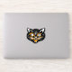 This vinyl sticker is a vintage Halloween black cat face with a smile showing its teeth with orange and white accents.