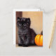 Postcard featuring a Halloween black kitten illustration. An adorable black kitty sits next to an orange pumpkin. A spooky gift for cat lovers and Halloween enthusiasts!