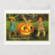 This postcard is a reproduction of a vintage Halloween postcard that features two boys carrying a large jack-o-lantern.