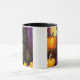 Coffee Mug featuring a vintage Halloween kitten! A fluffy black kitty poses next to pumpkins against a purple background. A fun gift for Halloween parties and cat lovers!