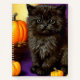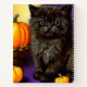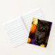 Notebook featuring a vintage Halloween kitten! A fluffy black kitty poses next to pumpkins against a purple background. A fun gift for Halloween parties and cat lovers!