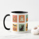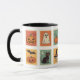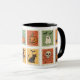 Add a fun, retro vibe to your autumn with this 11 oz white coffee mug featuring a black handle and interior, decorated with 12 vintage-style Halloween stamps. Each stamp showcases a classic seasonal character: a smiling pumpkin, a black cat, a playful ghost, a bat, a spider web, a cute skull, a hat witch and more.