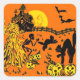 Square stickers with a vintage traditional Halloween scene of cats, bats, pumpkins, haunted house.