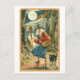 This postcard is a reproduction of a vintage Halloween postcard that features a witch with a black cat and an owl.