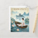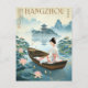 Step into the tranquility of West Lake with this ethereal vintage-style travel poster postcard for Hangzhou, China. The design features a serene figure in traditional Hanfu attire gently rowing a wooden boat amidst a field of beautiful pink lotus flowers. In the background, a classical pagoda sits on an island, reflected perfectly in the misty blue-green waters, framed by distant mountains. This artwork evokes the classical beauty of Chinese landscape painting and poetry. It's the perfect keepsake for China travel enthusiasts, collectors of retro Asian art, or anyone enchanted by the poetic scenery of Hangzhou.