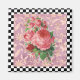 Pretty vintage pink roses botanical illustration on pink floral background with black and white chequerboard pattern border creates a lovely garden theme design.