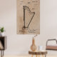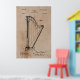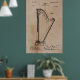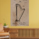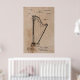 A technical patent diagram of an invention for a new style of harp dated 1899 which has been designed for wall art on a vintage style background.