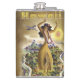 A charming vintage vinyl wrapped flask featuring a travel poster from United Air Lines of a hula dancing Hawaiian woman.