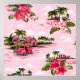 Vintage Hawaiian barkcloth design of tropical island scenes on a pink background. Seamless repeat pattern.