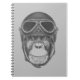 This design features a portrait of a chimpanzee wearing a vintage motorcycle helmet and goggle.