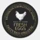 "FRESH EGGS" printed in a 3D embossed metallic gold font and a vintage hen illustration with fancy dotted border makes this a classy old-fashioned label for your egg cartons or hen house correspondence. Your business name and location are written in a quaint