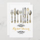 Spoil the bride to be with a beautiful old fashioned high tea bridal shower. DESIGN - An illustration of old fashioned knives, forks and spoons in faux silver and gold have intricate roses, arum lilies and grasses etched into them. A stylish floral swirl in black frames a golden coloured template which may be customised to suit your special wedding, engagement or anniversary.