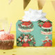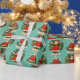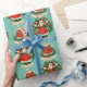 This pattern features a lighter, teal background with a repeated design of a girl dressed in a classic red holiday dress, paired with Santa Claus illustrations and festive wreaths. The images are framed with "Merry Christmas" or "Happy Holidays" banners, adding a delightful and vintage touch to the overall pattern. The design is elegant yet playful, making it perfect for wrapping special gifts.