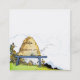 A custom square apiary business card with brown retro script and block letters and a vintage drawing of a happy straw beehive with buzzing bees with white clouds.