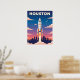 Celebrate Houston’s space legacy with this colourful retro‑style postcard featuring a rocket launch over the city skyline, vibrant sunset‑to‑night gradient sky, and bold “HOUSTON” typography – perfect for collectors, space enthusiasts, and vintage travel art lovers.