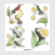 Set of four stickers with vintage illustrations of hummingbirds. Colourful green and red hummingbirds perched on tropical plants with yellow flowers.