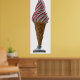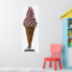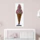 A vintage ice cream parlour statue in the shape of an ice cream cone, soft serve ice cream swirl In a waffle cone. Done in colours of red ,white, and chrome.