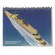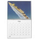 12 month vintage illustration travel calendar featuring travel scenes including cruise ships, aeroplanes, trains, cars and a bus depot.