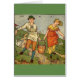 A vintage children's book illustration by Walter Crane for the story "Jack and Jill" depicts the two of them walking down the hill, carrying a bucket of water between them as it splashes out along the way. Walter Crane (1845-1915) was an English artist and children’s book illustrator considered to be the patriarch of the Golden Age of children’s books. Card is blank inside for your own message.