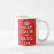 Everybody knows the slogan from the WWII poster: Keep Calm and Carry On. It's redone here for clog dancers and says, "Keep Calm and Clog On." The poster is also made to look vintage / retro through the use of distressed text and a worn, tattered, antique red background. This is a trendy mug design for the clogger / clogging fan.
