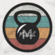 Vintage kettlebell custom monogram name initial with multiple coloured striped circle grey, turquoise, orange and red on a black blackground. Perfect for anyone who is lifting, fitness, training, bodybuilding and going to the gym.