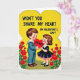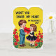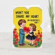 This Valentine's Day card shows a vintage-style scene with two sweet kids standing close together on a bright yellow background. The boy wears a blue sailor suit, and the girl wears a black dress with a white collar and a small pink ruffle. They look at each other with shy smiles and rosy cheeks, and their hands meet as they hold a red heart between them. The heart has the word “HEART” written on it in clear, dark letters right in the center. Along the bottom, red flowers with green stems add a simple garden touch. At the top, the message reads “WON’T YOU SHARE MY HEART ON VALENTINE’S DAY?” in black block letters that stand out against the yellow. It feels warm and friendly, like an easy way to say you care ❤️
