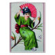 A vintage illustration in bright, vivid colours of a young lady in an emerald green kimono holding a bright pink fan. Card is blank inside for your handwritten message.