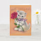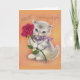 A vintage greeting card image features a cute grey and white kitten wearing a lavender ribbon tied in a bow. She sits on her haunches and holds a single stem red rose as if she's offering it to you. The front of the card say, "Hello! Thinking of You." The message inside the card is, "Hope everything is going well in your little corner of the world."