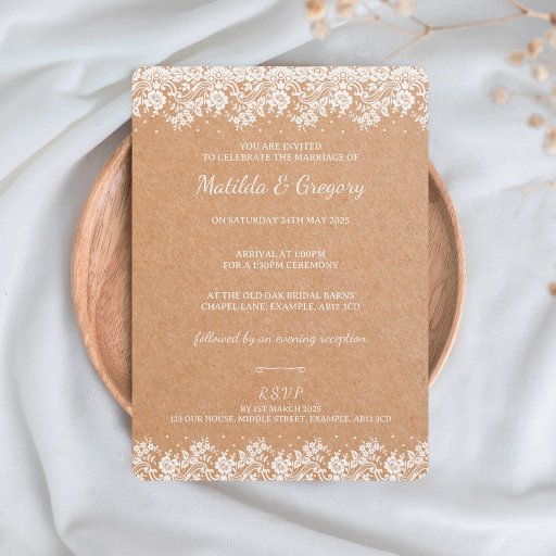 Introducing our Vintage Kraft Floral Lace Wedding Invitation, a timeless blend of rustic charm and elegant sophistication. Delicate white floral lace dances gracefully against a warm kraft brown backdrop, exuding vintage allure. Customizable wording allows you to infuse your unique personality into every detail.