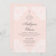 An elegant baptism invitation featuring soft white lace corners on a blush pink background.