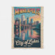 Celebrate the timeless beauty of the Twin Cities with this vibrant retro-style illustration of Minneapolis, Minnesota. Featuring the iconic Stone Arch Bridge spanning the Mississippi River and the IDS Center rising above the downtown skyline, this artwork captures the city’s architectural strength and scenic charm. Flowing water below reflects soft sunset hues, adding warmth and movement to the scene. “MINNEAPOLIS” arches across the top in bold vintage display lettering, paired with elegant cursive “City of Lakes” and a classic “EST. 1867” block-style detail. A cool yet inviting color palette of blues, lake teal, and soft sunset orange, combined with gentle gradients and textured shading, creates a nostalgic mid-century travel poster aesthetic. Perfect for Minneapolis locals, Minnesota natives, lake lovers, or fans of retro Americana city art.