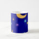 A mug with elegant vintage etching of stars and a glowing crescent moon against a dark blue sky.