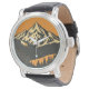 A vintage-inspired design featuring a majestic mountain peak bathed in the warm glow of a setting sun. The mountain is surrounded by a dense forest of pine trees, creating a peaceful and serene atmosphere.