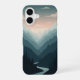 Retro illustration of a layered mountain valley in a cool and soothing palette.