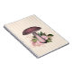 Pretty vintage look notebook design features pink tinted mushroom with pink florals and lush green leaves on a vintage striped background