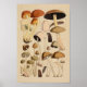 Vintage 1860 botanical illustration of a variety of mushrooms. Green and brown.