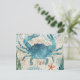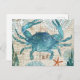 Nautical blue crab with two, brown, vintage ships, and a reddish starfish illustration underneath, on a vintage nautical map background with other retro, grungy, teal/ivory, seagrass, seaweed or seashells in background.
