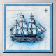 A detailed sketch of a large sailing ship with multiple masts and sails, navigating the open sea. The ship’s rigging and flags are visible, and it appears to be in motion. Rays emanate from the upper right corner, possibly representing the sun, and a compass rose symbol is adjacent. The drawing style evokes traditional nautical artwork.