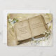 Vintage book with flowers, quill pen and customised name of couple for wedding vow renewal invitation.