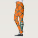 Unique orange, green and black Halloween argyle, diamond pattern leggings. Reminiscent of a late 1800s or early 1900s style pattern. Features dancing jesters on the lower legs. One with a pumpkin head and the other a dancing cat.