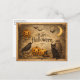 A richly detailed, vintage-style Halloween illustration framed with ornate Victorian embellishments and set against a warm, parchment-toned background. Smiling jack-o’-lanterns rest among fallen autumn leaves, accompanied by a classic black cat, a wise owl, and a watchful raven—timeless symbols of Halloween folklore. A crescent moon and fluttering bats illuminate the dusky sky, while elegant, antique-inspired typography proclaims “Happy Halloween.” The muted sepia palette and aged texture evoke the charm of 19th-century ephemera.