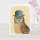 Add custom text inside! Vintage barn owl wearing a green derby hat on a craft paper look background with grunge edges.