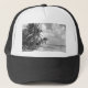 Vintage black and white photograph of a tropical beach with palm trees stretching over the sea.