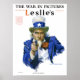 Vintage illustration patriotism military war magazine cover from Leslie's, December 29, 1917 by James Montgomery Flagg. This World War I cover art features the iconic Uncle Sam with a stern look pointing a gun at you and wearing a patriotic stars and stripes hat, the title is The War in Pictures and the tagline reads "Get off the throne."