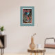 This print features a reproduction in dry-brushed fresco style of a French poster for an art exhibit in 1898, the height of the Art Nouveau fine art movement. It depicts a splendid Peacock in shades of blue, turquoise on a multicolored background of muted reds and browns.
